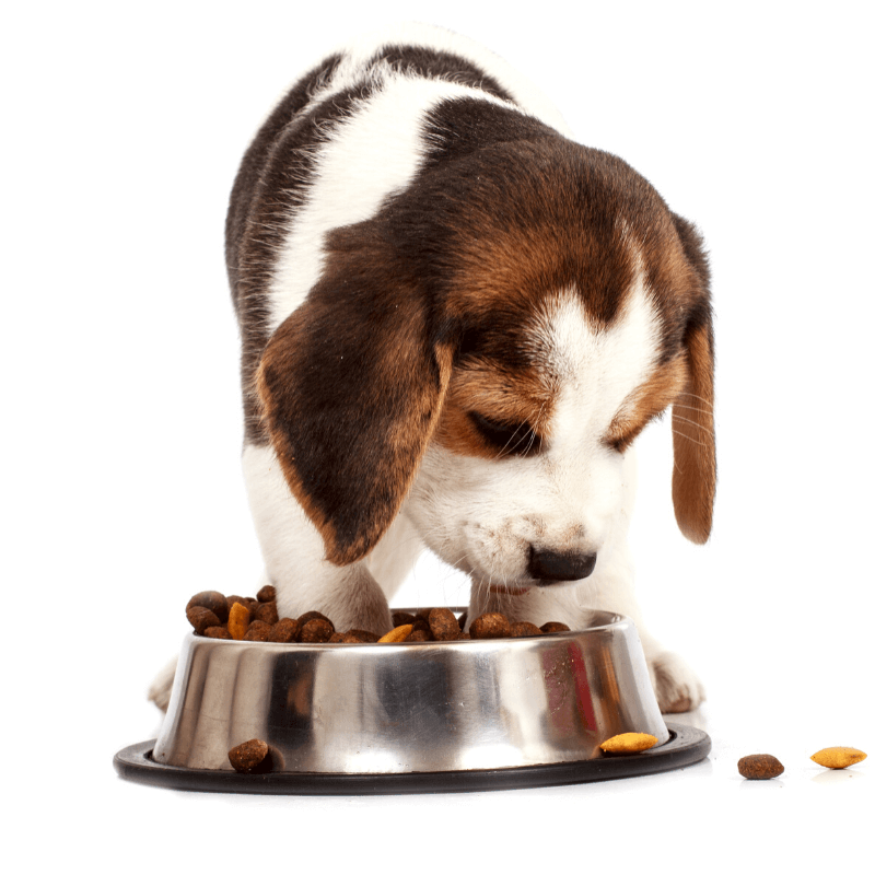 Puppies and kittens should be fed measured meals between three to four times daily up until about four to five months when most will tolerate being transitioned to two meals daily though individual feeding schedules and volumes may vary. Free feeding is not recommended as overfeeding and obesity is a major concern for most adult dogs and cats. Obesity increases risk for orthopedic diseases, arthritis, liver disease, diabetes, and urinary tract disorders.